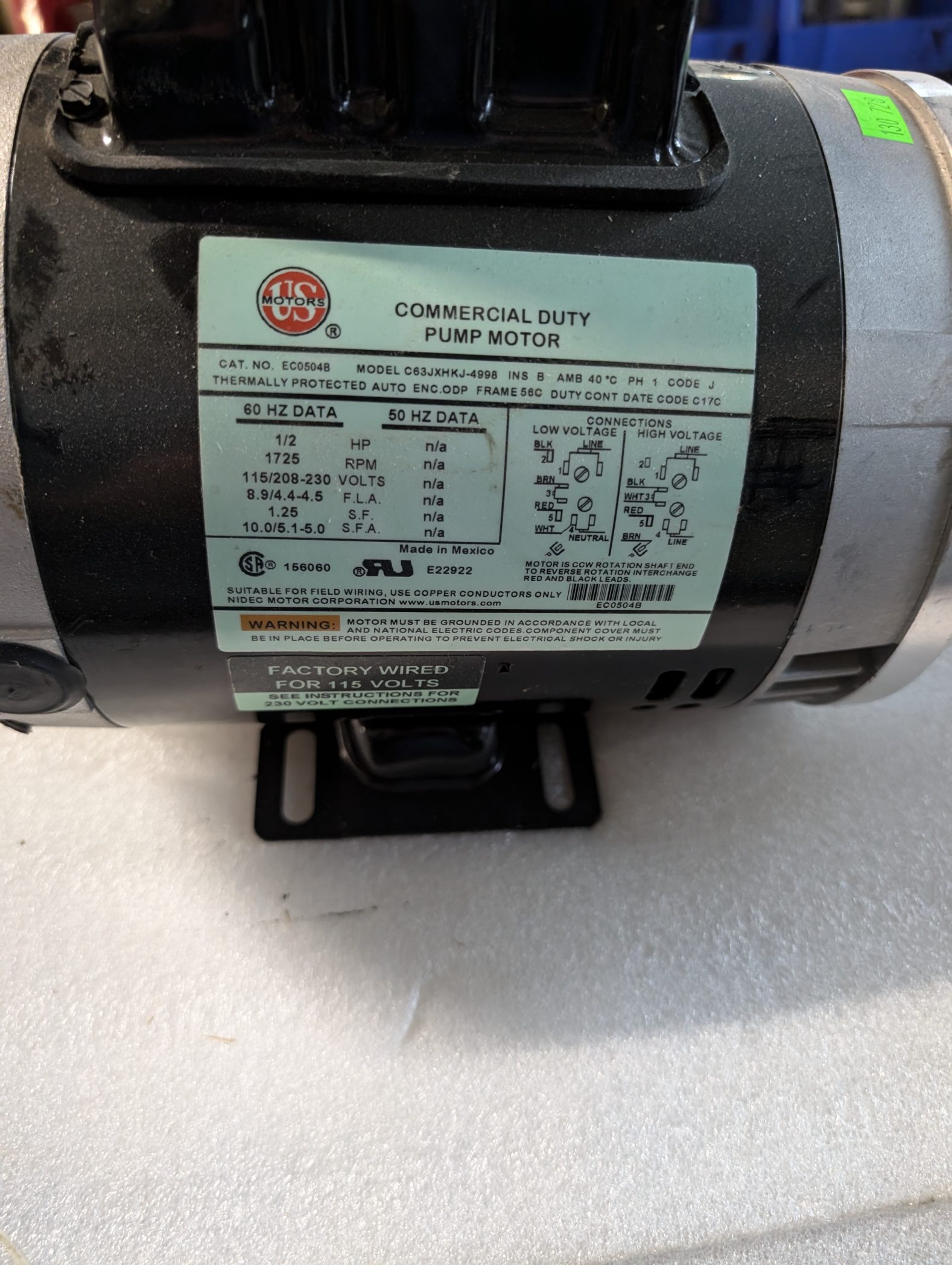 US Motors Electric Motor Half HP 1725RPM 115-208-230V 60Hz 1.25 1Ph